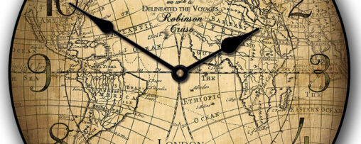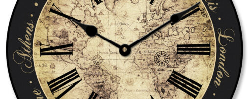 A wonderful, stylish map clock with a world map printed on the face based on Daniel Defoe’s Robinson Crusoe. (Crusoe without the E is the old spelling…I took it off on the clock for the sake of authenticity. It is not a mistake :)) This is one of our favorite map clocks because of the history of the map featured. The warm colors are also beautiful in a room. It looks great as an office clock