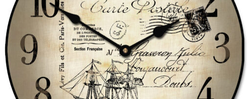 A charming nautical clock with a black, postal themed print on a light tan face and black accents. This looks great in your living room, bedroom, or office. Many sizes to choose from, and frames can be added as well.