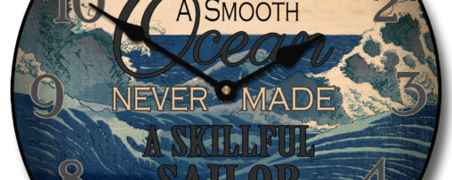A charming nautical clock with an inspirational theme in black print on a light tan face and black accents. This looks great in your living room, bedroom, or office. Many sizes to choose from.