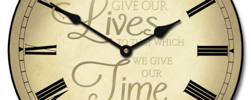 A charming clock with an inspirational theme in black print on a light tan face and black accents. We give our lives to that which we give our time–a very appropriate quote for a clock. This looks great in your living room, bedroom, or office.