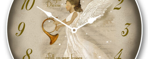 This beautiful Christmas clock features an angel print on a light tan face. This makes for a great holiday clock for your living room or office. This wall clock is available in many sizes.