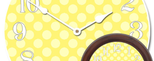 This is a cute, fun yellow clock with a white, polka dot pattern on the face. The design is simple but it looks bright and happy–a great addition to your child's bedroom or even your own. This wall clock is available in other colors as well. Many sizes to choose from! Frames are available, too.